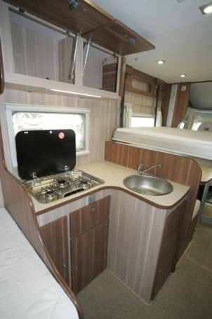 La cuisine reste assez sommaire dans sa présentation. Mais, à part ce point d’ordre esthétique, impossible de lui reprocher autre chose, disposant de tout le nécessaire. On y trouve même un grand réfrigérateur de 160 litres à sélection automatique d’énergie. Le couchage en position latérale (220 x 150 cm) est bien proportionné et constitué d’un matelas de mousse et d’un sommier à lattes. Côté salle d’eau, notez que la douche séparée se trouve dans le prolongement du cabinet de toilette.