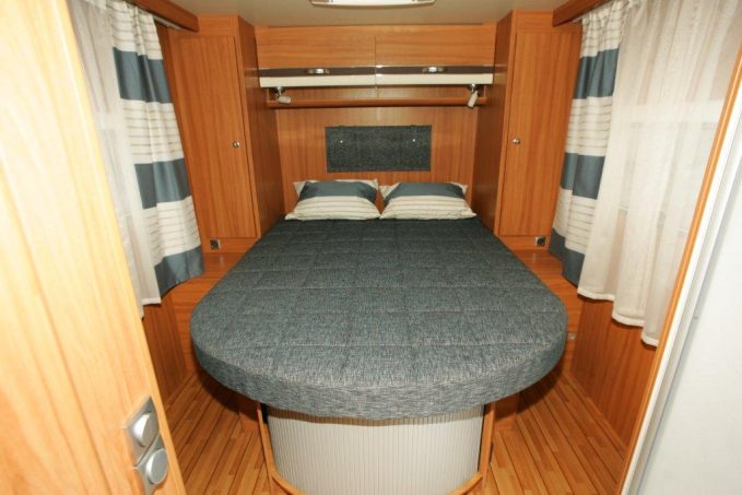 Pour la nuit, la configuration très classique de la chambre permanente n’empêche pas qu’un certain souci soit apporté aux détails. Ainsi apprécie-t-on la multiplicité de rangements derrière le rideau à lattes en façade de lit. Nous regrettons, en revanche, la présence d’un simple rideau de séparation entre chambre et salon.