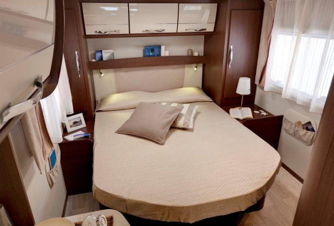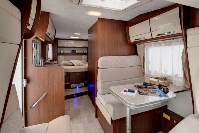 La partie nuit offre une présentation très agréable avec une belle led bleutée au pied du lit. Mais elle souffre de la proximité du meuble de cuisine et d’une absence de cloison ou de rideau de séparation avec le reste de la cellule. Et puis… gare à la marche !