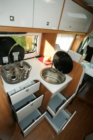 Côté cuisine et salon, tiroirs profonds et meubles hauts rendront bien des services. Les façades de placards comme la sellerie bi ton ne manquent pas de cachet. Le mobilier utilise des matériaux allégés (panneaux alvéolés) afin de mieux maîtriser le poids et préserver la charge utile. De quoi partir avec quelques équipements en plus et opter pour le pack Confort facturé 1086 € (ESP, airbag passager, pré-équipement autoradio et moustiquaire de porte) sans craindre la surcharge. La soute, elle, est accessible par deux portillons.