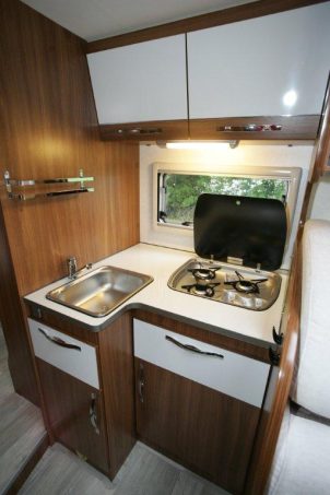 De série, la porte de cellule est pleine et non pourvue d’une baie (contrairement à ce que montre notre photo). En revanche, dans la version de base, la soute est bien équipée de deux portillons, indispensable dans le cas d’une soute traversante. Finalement, le gros reproche à adresser à ce Moovéo concerne la capacité des réservoirs d’eau, vraiment insuffisante. L’écran de télévision est logé dans le placard au-dessus du réfrigérateur. Pour unvisionnage agréable depuis la chambre, il faut prévoir d’ajouter un bras sur la cloison du cabinet de toilette.