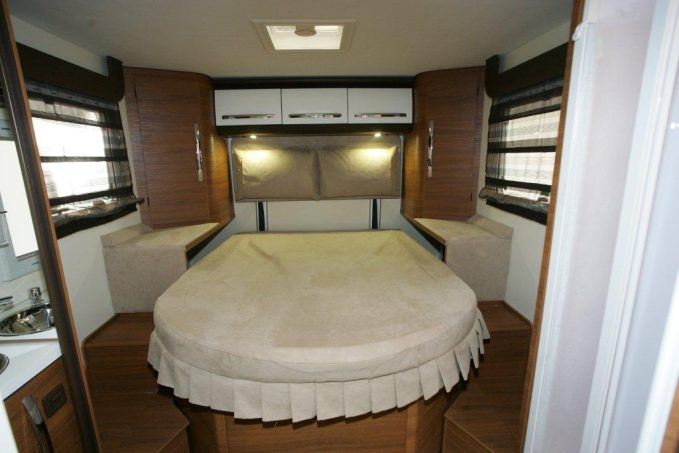 Pour la nuit, le lit central surmonte une soute garage au volume modulable. Pour ce faire, le couchage monte et descend à l’aide d’un mécanisme électrique. L’abaissement du lit de pavillon se fait aussi sans effort. Et n’oublions pas la cloison japonaise coulissante, qui sépare l’avant de l’arrière.