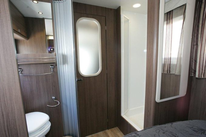 Ce profilé Européo à lit de pavillon et lit central a été lancé au printemps dernier, il s’agissait alors de la Silver Line. Le constructeur a conservé les caractéristiques de cette série spéciale, notamment la cabine grise tandis que les bas de caisse, également en teinte grise, créent une homogénéité de couleur de l’ensemble du profilé. Pour installer le lit de pavillon, Rimor est allé au plus simple : pas de casquette rehaussée, le couchage double venant simplement se loger sous le profilage d’origine. Il s’ensuit que la hauteur libre intérieure n’est pas très importante sous la coque du lit. Mais, à l’usage, cela n’est pas gênant, sauf pour les “géants” de plus d’1,80 m. Le lit central offre lui de bonnes dimensions (98 x 140 cm).