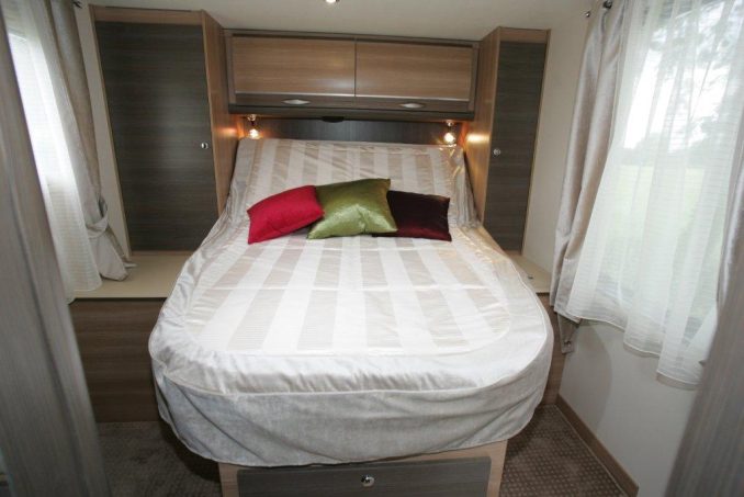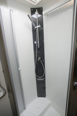 La cuisine en L est nantie d’un évier double bac en inox. Ses rangements sont multiples et bien conçus : vastes tiroirs, alvéoles à bouteilles… soulignons que la hotte aspirante est de série. Côté chambre, enfin, le lit central est un exemple de confort. Le sommier à tête relevable est associé à un excellent matelas en mousse Bultex. Aussi, un grand bac à linge sale est masqué par une trappe devant la penderie gauche.