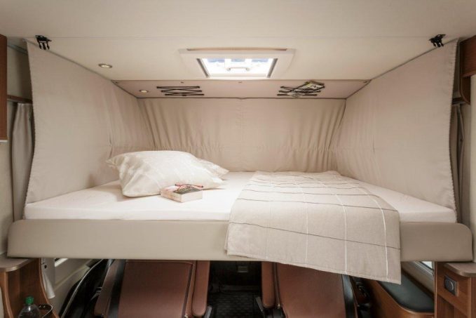 Deux lits occupent l’habitacle. Le couchage permanent transversal surplombe une vaste soute garage. Le lit de cabine, qui s’abaisse aisément, est bien aéré. A noter la présence au plafond d’élastiques entrelacés, destinés à maintenir des magazines.