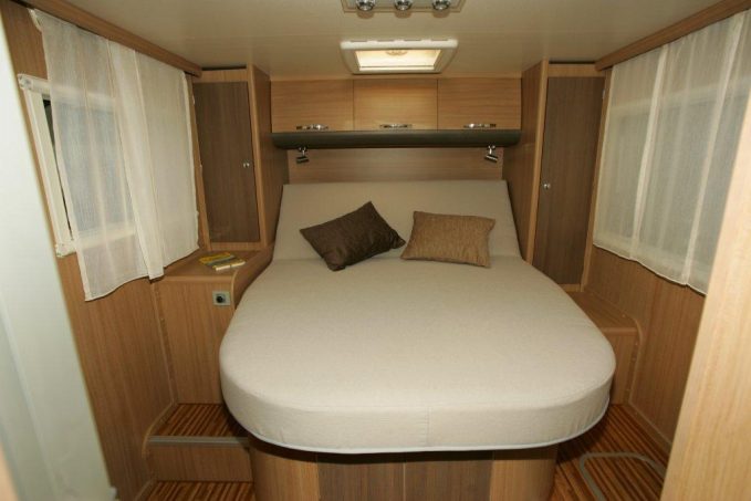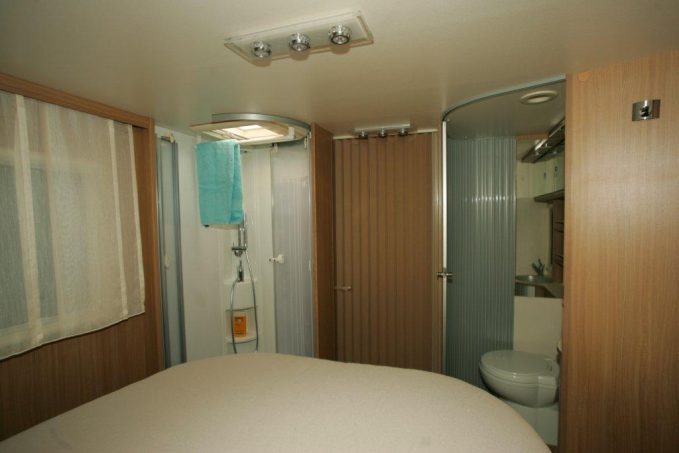 Sensible au confort des utilisateurs, Adria a soigné le standing des parties jour et nuit. Le maxi salon accepte de cinq à six personnes. Le lit central est constitué d’un bon matelas de mousse et d’un sommier à lattes. La salle d’eau est formée d’un seul module (sans doute pour limiter la longueur de la cellule). Par conséquent, la douche est intégrée au cabinet de toilette, mais une porte plexiglas fait toutefois office de séparation.