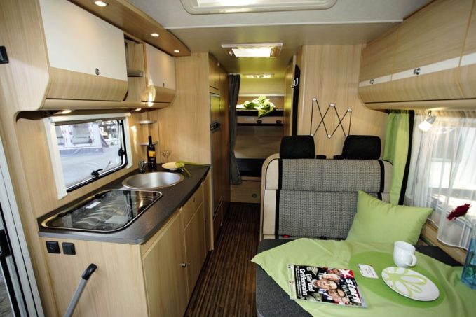 Un plan évident pour cette capucine avec dînette classique et couchettes transversales superposées. L'atout, c'est le pack sécurité : une 5e place CG. On peut monter à 3 850 kg et de bénéficier de 6 places nuit et CG.