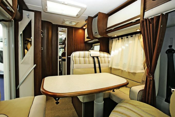 Ce 580 L se démarque par ses petites baies dans les jambages, son chauffage Webasto et son aménagement : lit central sans rupture de niveau au sol, cabinet de toilette et douche en modules séparés, maxi salon...