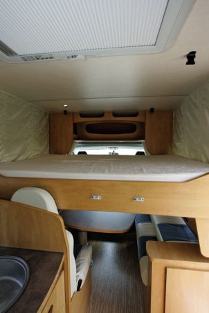 Lit de pavillon et à la française, c’est le plan le plus fédérateur. En outre, aucun espace de vie n’est sacrifié et surtout pas la banquette, transformable en fauteuil route supplémentaire ou la cuisine (en L). Seule la douche isolée du cabinet de toilette manque de profondeur. Le lit de pavillon (135 x 190) se révèle assez vaste pour deux adultes, tandis qu’un un petit enfant peut encore prendre place sur le lit d’appoint de la dînette. Voilà qui offre de multiples solutions de couchage.