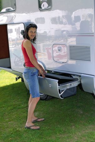Le 966 MH est l’un des quatre poids lourds de la flotte Rapido. La cellule repose sur un châssis-auvent Mercedes Sprinter à roues jumelées. Le ptac important dégage une forte charge utile. Ce qui est bien, car le 966 MH est pourvu d’un vaste garage d