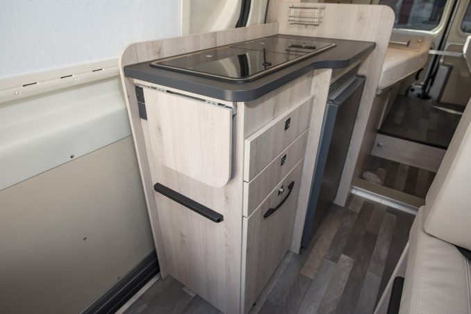 L’aménageur français Font Vendôme se consacre uniquement aux vans, un secteur où il évolue dans le top 10 des ventes. Dans sa collection 2018, il propose le nouveau Master Van Duo en exploitant le Renault Master dans sa version longue (6,20 m). Inspiré du Master Van XS, il dispose du même salon avec une banquette face route et les sièges cabine pivotants. Quatre personnes peuvent s’installer autour de la table centrale qui peut s’agrandir à l’aide d’une rallonge. Le bloc cuisine est étroit mais fonctionnel : évier, réchaud deux feux et plan de travail rétractable. Il offre tout le nécessaire pour cuisiner.