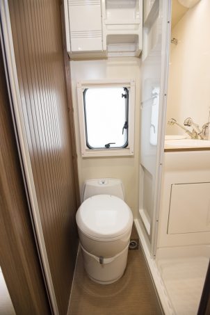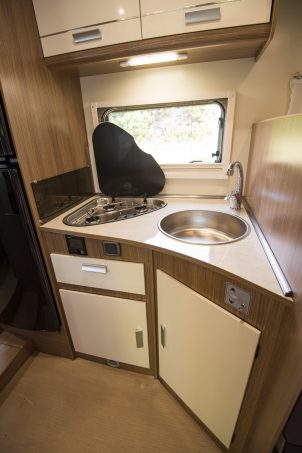 A bord du PM 740, la sobriété est de mise. Dans le salon, une courte banquette sans retour et un petit sofa sont disposés autour d’une table fixe équipée d’une rallonge. Adossé à la banquette, le bloc cuisine est simple mais ne manque de rien : réchaud 3 feux, évier et réfrigérateur de 150 l. Juste en face, se trouve la salle d ’eau à laquelle on accède par le cabinet de toilette. Une implantation inhabituelle dont on vous laissera juger le côté pratique.