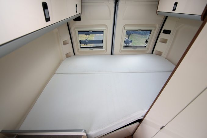 En chambre, le lit transversal sur soute repose sur un sommier relevable à tulipes Froli. Cela permet de moduler l’espace arrière à sa guise. De part la compacité du véhicule, le matelas ne présente pas la même largeur à sa tête et au pied (197 x 130/115 cm).