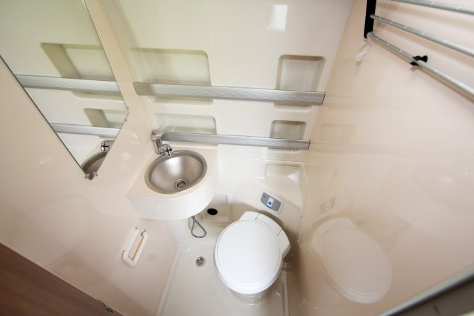 La salle d’eau regroupe en un même endroit WC (à cuvette tournante), lavabo (fixé dans l’angle) et receveur de douche.