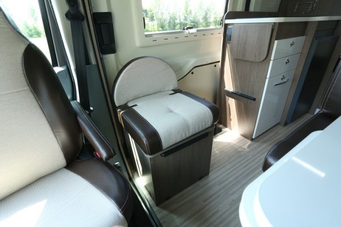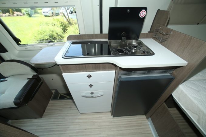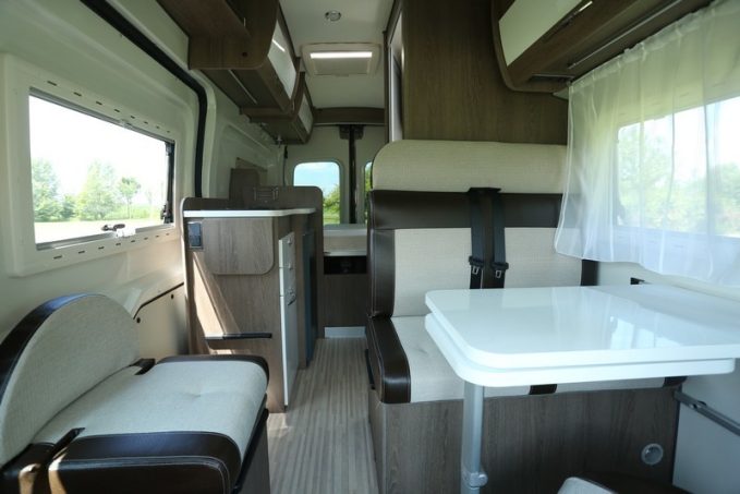5,99 m de long pour 2,05 m de large, le R560 exploite la version 4x4 du Ford Transit. Une particularité qu’il faut souligner puisque l’utilisation d’une base tout terrain pour les fourgons aménagés n’est pas courante sur le marché européen. Randger est ainsi précurseur. Pour ce qui est de l’implantation en revanche, le constructeur est resté classique. Le salon est composé d’une banquette double face route, complétée par un petit sofa longitudinal. Les sièges de la cabine pivotent pour permettre à deux convives supplémentaires de prendre place autour de la table amovible. Quant au bloc cuisine, il est équipé d’un réchaud 2 feux, d’un réfrigérateur à compression de 90 l, d’un évier en inox et d’une rallonge.