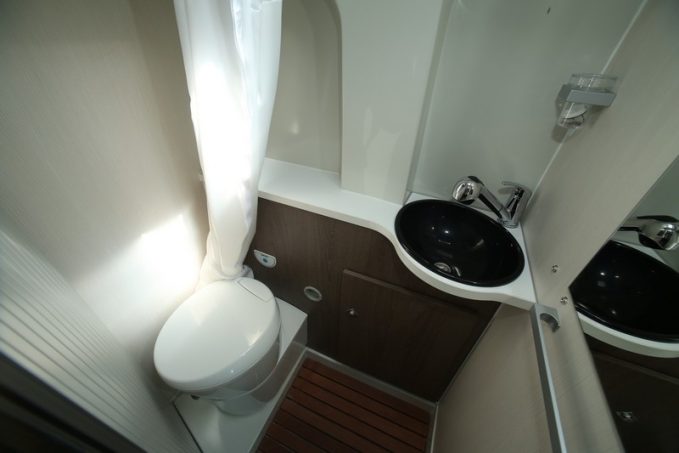 Face à la cuisine se trouve la salle d’eau. Elle contient un WC pivotant, un bac à douche et un lavabo avec douchette. Tout au fond du véhicule, prend place un grand couchage transversal de 137 x 189 cm avec un matelas qui repose sur un sommier à lattes. Au niveau de la dînette, après manipulation de la table et des banquettes, vous pourrez obtenir un troisième couchage de 107 x 172 cm.