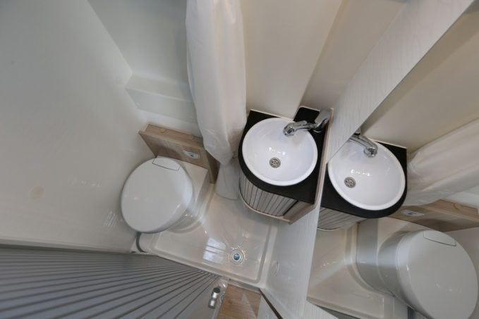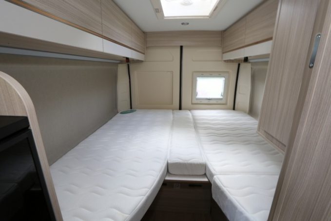 Avant d’accéder à la partie arrière du véhicule, on trouve, accolée à la banquette du salon, une salle d’eau d’une taille très correcte. Vous y trouverez tout le nécessaire : wc, lavabo et douche. Dans la chambre, les deux lits jumeaux sur soute ajustable, mesurent 80 cm de large avec une taille de 1,95 m de long pour l’un et 1,92 pour l’autre. Au pied du plus court, se dresse une penderie fonctionnelle.
