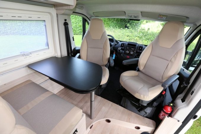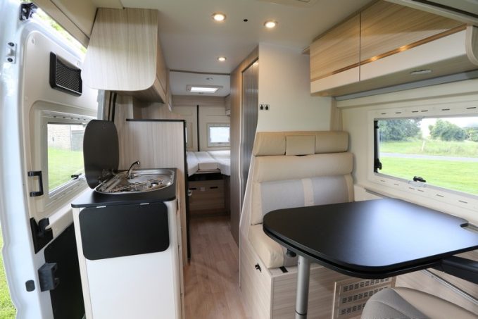 Avec ses 6,36 m, le D68 est le plus long fourgon de la famille Dreamer. Conçu pour accueillir les 4 places homologuées sur la carte grise, le salon est composé d’une banquette transversale et des deux sièges cabine pivotants. Le bloc cuisine, équipé d’un réchaud 2 feux, est recouvert d’un revêtement stratifié noir mat. Une matière saillante également utilisée pour la table et sa rallonge. Notez que le constructeur a opté pour un évier en inox et un réfrigérateur de 135 l pour compléter la partie cuisine.