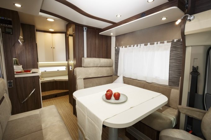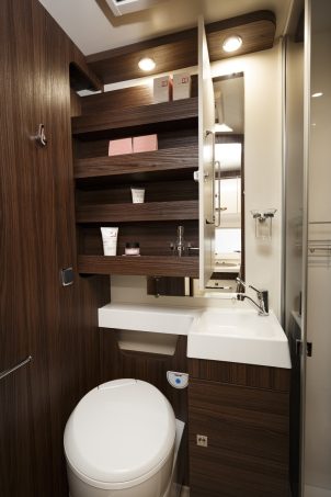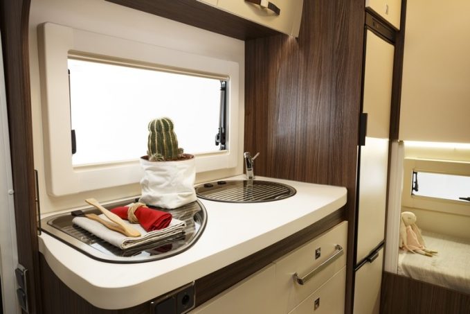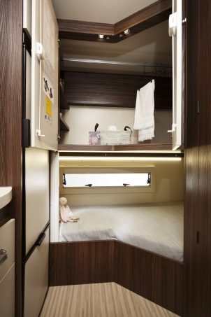 Côté ambiance, Benimar a fait le choix d’un camaïeu marron clair. Les tissus sont taupe et beige, agrémentés d’un liseré chocolat. Le mobilier est couleur chêne foncé avec des portes de placard blanc laqué. Grâce au Skydome placé sur la casquette du profilé, l’intérieur bénéficie d’une belle lumière malgré le lit de pavillon.