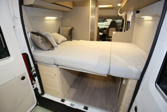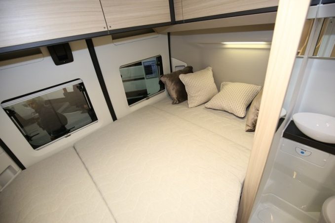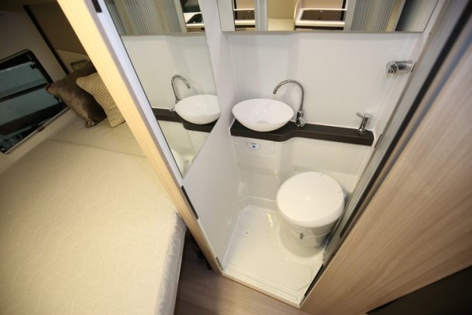 Du côté du couchage (127/113 X 196 cm), l’Adria Twin Plus 540 SP mise à la fois sur le confort (sommier à lattes, matelas épais en trois parties) et aussi sur la modularité. Le sommier est amovible en son milieu et la soute arrière peut ainsi accueillir momentanément un ou deux vélos. Cela permet aussi d’accéder aux rangements sous le couchage. À l’heure de la toilette, Adria joue la carte de la modularité puisque l’espace dédié est mesuré mais équipé d’une cloison pivotante transformant le cabinet de toilette en cabine de douche.
