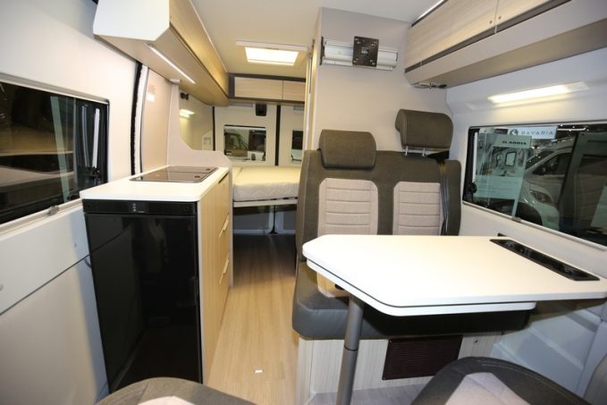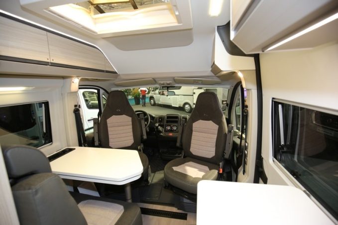 Voilà un strict deux places nuit particulièrement cosy et fonctionnel. En entrant, on apprécie tout de suite le travail des ingénieurs qui ont planché sur une meilleure intégration de la cabine avec la partie habitable. La cabine a gagné en hauteur, donc en volume, et en accessibilité : nul besoin de se baisser pour s’installer et prendre la route. A l’heure des repas, cette configuration rend la dînette plus agréable encore. Par ailleurs, la grande fenêtre de toit, en apportant de la lumière, génère une sensation de clarté. Un bon point également pour l’ambiance intérieure soignée (mobilier et tissus) qui se décline en deux finitions Sandy white (plus clair) ou Sandy Brown (plus sombre).
