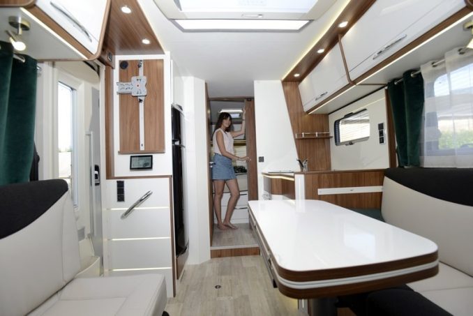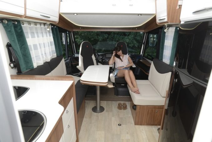 Malgré une conception spécifique du salon face-face l’an passé, Pilote a revu sa copie pour cette collection avec l'inédit G740 FC. Ce modèle reprend donc la recette basique de ce salon lounge, avec des assises “droites” en vis-à-vis. Dès la montée à bord, la sensation d’espace prédomine avec la grande profondeur en partie centrale du véhicule. Au roulage, les banquettes se transforment en places face route. Il suffit, pour cela, d’insérer les dossiers amovibles dans les encoches prévues à cet effet et d’ajouter des coussins. Le vaste plateau est monté sur un pied central. La table en portefeuille peut se rabattre par moitié, libérant ainsi le grand couloir de circulation, entre la cabine et le reste de l’habitacle, agrémenté qui plus est d’un plancher totalement plat.