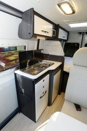 Le Master Van XS a pendant plusieurs saisons occupé la première place des ventes chez Font Vendôme. Une petite baisse de popularité a peut-être décidé la marque de Brantôme a augmenté son pouvoir de séduction. Au printemps, elle a lancé ce Master Van XS en édition limitée Dark Serie, qu’elle a officiellement intégrée au catalogue 2019. Bridé au Renault Master, ce véhicule présente l’avantage d’un gabarit contenu (5,48 m). A son bord pourtant, l’agencement se montre optimisé et fonctionnel. La partie avant, composée d’une banquette face route et des sièges cabine pivotants, forme le coin repas. Font Vendôme a installé une nouvelle table avec une rallonge plus pratique à mettre en place. A contrario de la cuisine – petite, mais parfaitement disposée –, la salle d’eau profite d’un espace étriqué dans laquelle lavabo, WC et douche cohabitent.