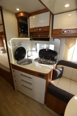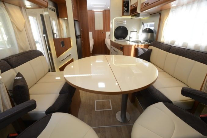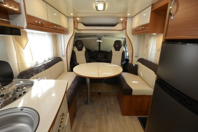 Le profilé Magister 73 LJF avec son châssis à voie élargie Fiat, se calque sur le modèle Fleurette Migrateur 73 LJT qui disposait lui, d’un châssis AL-KO. Remanié de 3 cm supplémentaire, il propose à la fois un salon plus confortable avec 2 banquettes placées en vis-à-vis (et chacune transformable en siège individuel pour circuler sur la route) et un cabinet de toilette transversal (situé à l’extrémité arrière). Pour faciliter l’usage des WC, la salle d’eau reçoit une vasque de lavabo basculante. En face, on trouve une grande cabine de douche équipée de portes rigides pliantes.