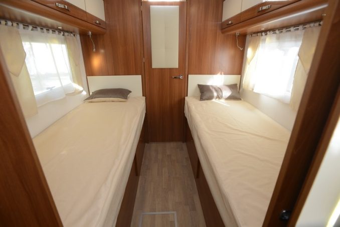 C’est donc une implantation plutôt atypique qu’adopte ce Migrateur 73 LJF. Les deux lits indépendants (de même longueur) sont calés entre la partie sanitaire (à leur tête) et le coin cuisine (à leur pied). Ainsi, l’espace en chambre se résume à un couloir bordé des lits jumeaux, eux-mêmes surplombés de placards. Pour pallier à l’absence de soute, chaque sommier se relève latéralement pour libérer deux grands coffres de rangements, également accessibles, de l’extérieur, par un portillon. L’intimité est assurée par une porte coulissante côté salon, et battante côté toilette. Enfin à l’avant, le lit de pavillon avant électrique, parfaitement dissimulé dans le plafond, peut assurer le couchage de deux adultes.