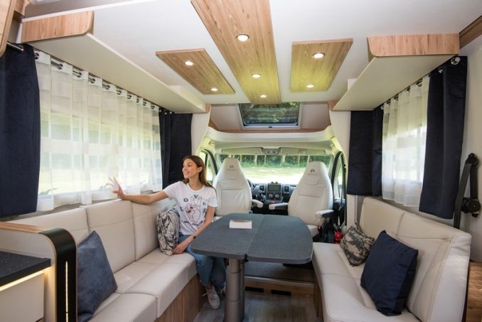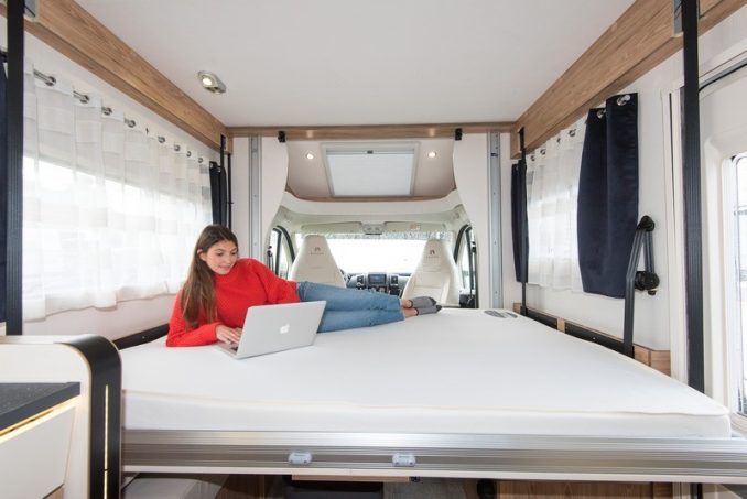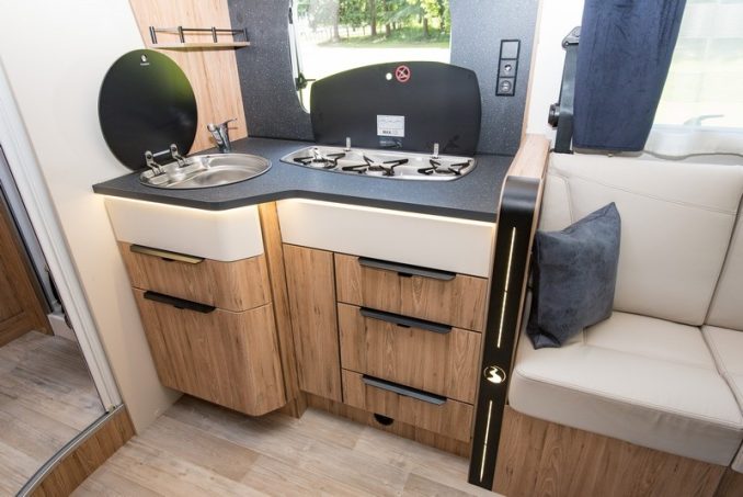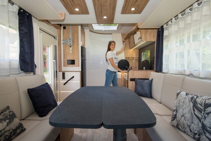 Avec son gabarit de moins de 7 m, le T696 D offre un espace salon spacieux et convivial, avec la disposition des banquettes en vis-à-vis, grâce à l’absence de couchage permanent. Les deux larges sofas accueillent sans peine quatre convives autour de la table, à pied décentré et qui se replie en portefeuille. Deux autres personnes pourront prendre place sur les sièges de cabine pivotants. Dans le prolongement de l’assise de gauche, la cuisine en L inversé se montre pratique. Notons d’ailleurs l’élégance du nouveau plan de travail ! En face de ce poste, on trouve le grand réfrigérateur de 160 l. Mention spéciale pour le support qui permet de ranger la télévision à la verticale. Un gain de place qui permet aussi d’opter pour un écran jusqu’à 32 pouces.