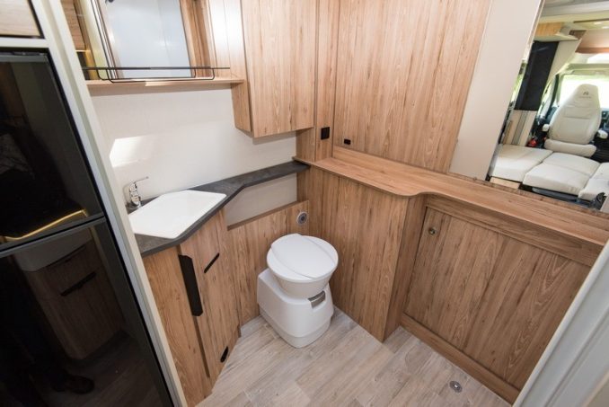 Prévu pour deux, le T696 D ne propose pas de couchage permanent au plancher, mais un lit de pavillon électrique affichant de belles dimensions : 160 x 200 cm. Deux hauteurs sont prédéfinies, la plus basse étant logiquement la plus recommandée, à moins d’avoir opté pour la dînette transformable pouvant offrir un tirant d’air suffisant pour les uns ou les autres. C’est au moment d’aborder la partie arrière que l’atout principal du T696 D se dévoile. En effet, l’intégralité de l’espace y est dévolue à la salle d’eau et au dressing. Large cabinet de toilette, coin douche conséquent et clos par une porte rigide, l’endroit est agréable, surtout avec les deux lanterneaux qui assurant une belle luminosité, et bien pensé. Les rangements prennent place dans la cloison du fond où une trappe permet d’accéder à la soute. Bien entendu, l’ensemble est isolable du reste de la cellule, grâce à une porte à lamelles rigide.