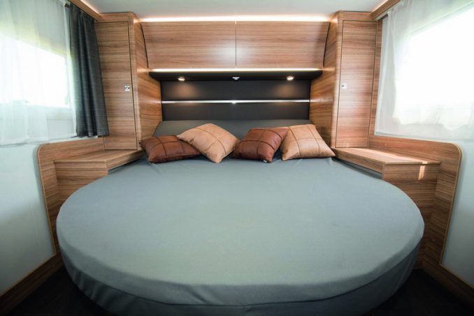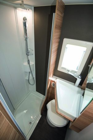 La chambre s’articule autour d’un lit central aux dimensions respectables (192 x 150 cm) et doté d’un matelas mousse haute densité et d’un sommier à lattes. Des penderies sont disposées de part et d’autre, tandis que la tête est surmontée de placards. En complément du couchage principal, un lit de pavillon électrique surplombe la cabine. Une fois abaissé, ce dernier préserve en grande partie la dînette. Quant à la salle d’eau, elle n’est hélas pas très grande, mais elle laisse assez d’espace pour disposer d’une véritable cabine de douche et d’un WC fixe. Seule la vasque est escamotable, facilement, au bas du placard à porte miroir.
