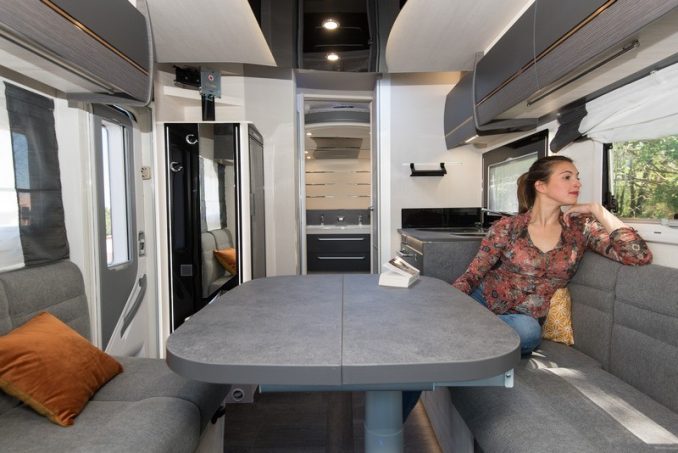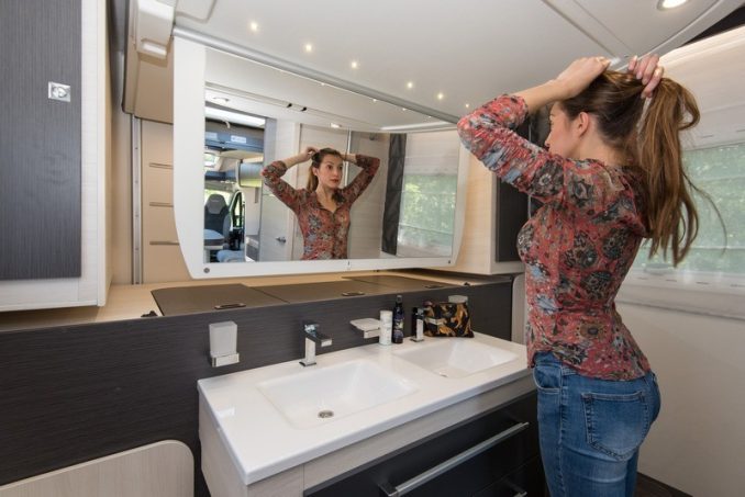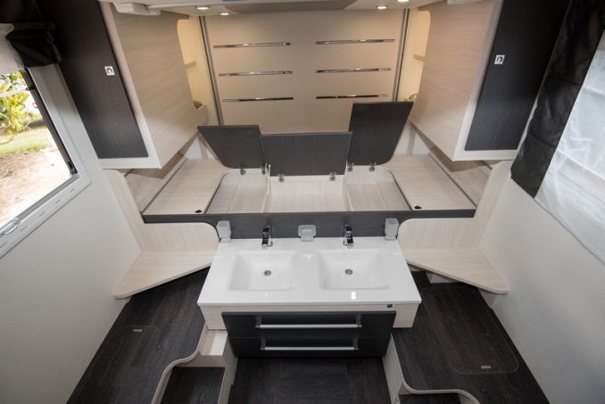 Nous vous l’avions déjà présenté en vidéo sur notre chaîne YouTube mais chez Chausson. Le profilé 338 de Challenger dispose du même plan atypique, témoignant de l’audace des ingénieurs de la marque qui savent être innovants et originaux ! Commençons la visite par le salon lounge, qui se distingue par son aspect aéré et spacieux. Lorsqu’on pousse la porte de démarcation entre la sphère de vie et la partie arrière, nous arrivons sur une salle d’eau avec… deux vasques, comme à la maison. Du jamais vu ! Challenger a développé un système baptisé SmartSuite revendiquant toutes les fonctionnalités d’une suite parentale avec rangements, salle d’eau donc et couchage. Le tout dans seulement 6 m2.
