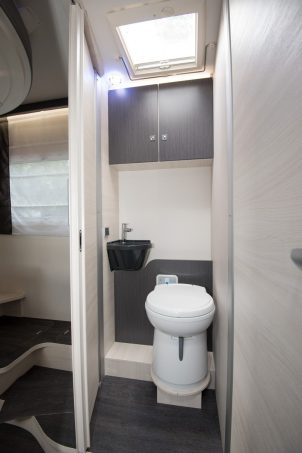 Cette zone arrière surprenante sert à la fois de grand cabinet de toilette et de chambre, où Challenger a logé un lit central… en pavillon. Comment ? Une fois la descente du couchage amorcée, le système de rangement EasyBox et le meuble vasque s’abaissent pour libérer l’espace. Il est aussi possible de les bloquer pour conserver la toute la hauteur en soute. Le lit central se trouvera plus haut, d’où la présence des marches latérales. En partie avant, la capacité d’accueil nocturne peut être augmentée en ajoutant un lit pavillon de 140 x 190 cm (option à 800 €).