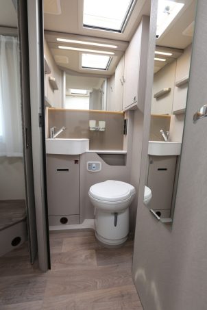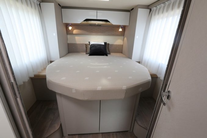 La chambre est organisée autour d’un lit central de 190 x 150 cm. Ce dernier voit sa tête relevable, pour offrir plus d’espace en pied le jour, voire de s’assoir pour lire, par exemple. Deux hautes penderies sont disposées de part et d’autre, tandis qu’un grand placard est aménagé sous l’avant du couchage. L’accès au matelas est aisé, malgré la présence, de part et d’autre également, d’une marche. Deux portes coulissantes isolent espace nuit et salle d’eau dédoublée. Et la battante du cabinet de toilette peut la séparer de la partie cuisine/dînette et créer un espace toilette transversal. En option, un large lit de pavillon électrique pour deux (188 x 130/105 cm) est disponible, ainsi que la possibilité de transformer la dînette en couchage simple.