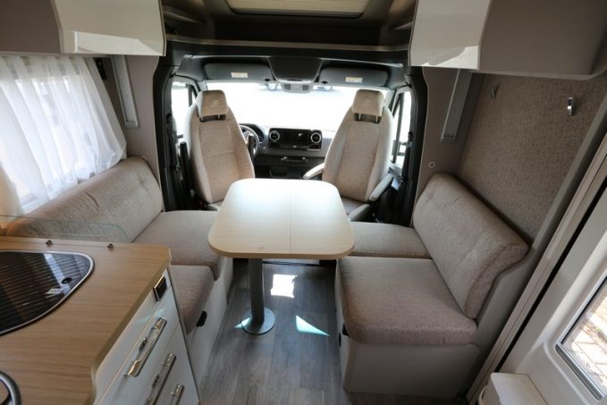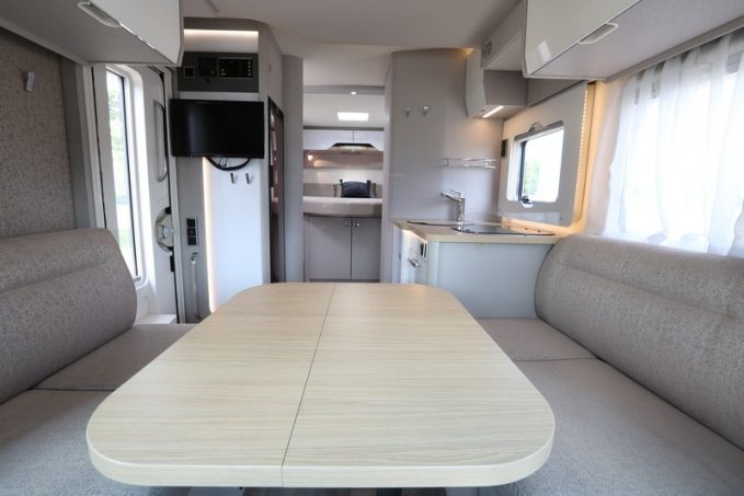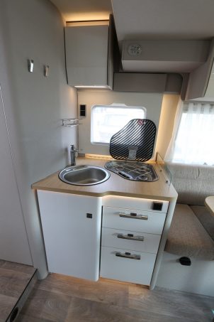 Ce nouveau profilé sur Mercedes Sprinter s’étire sur 7,39 m de long. De quoi offrir un bel espace, d’autant que ce véhicule est prévu pour un couple. En dînette, nous retrouvons un salon face-face dont les deux sofas abritent des sièges face route. Entre eux, la table, orientable dans les deux axes, repose sur un pied excentré et dispose d’une partie rabattable (mais non repliable), facilitant les passages entre cellule et cabine. Dans le prolongement de la banquette gauche, le petit meuble de cuisine accueille un réchaud 3 feux et un évier rond. En dessous, trois tiroirs, dont un casserolier, et un placard. Le grand réfrigérateur est déposé en face. L’ensemble est habillé de coloris neutres, mais chaleureux, et revendique une belle qualité de réalisation. Notons également la volonté de Hymer de se libérer de l’encombrante et lourde réserve de gaz, en utilisant un réfrigérateur exclusivement électrique et un chauffage carburant. Résultat, le Tramp S se contente de deux petites bouteilles de gaz de 3 kg.
