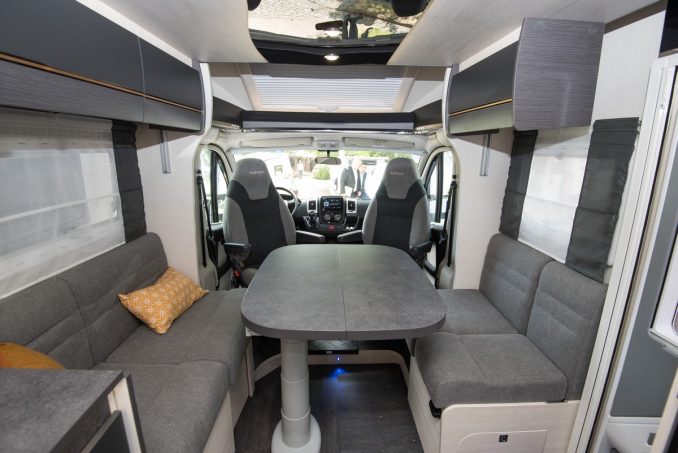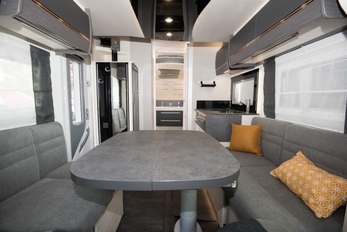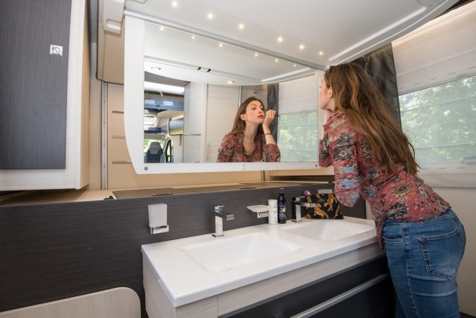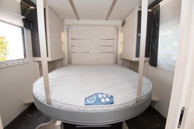Cette zone arrière surprenante sert à la fois de grand cabinet de toilette (avec deux lavabos et un très grand miroir rétractable) et de chambre. Challenger a ressorti des cartons des innovations précédentes et a logé un lit central… en pavillon. Comment ? Une fois la descente du couchage amorcée, le système de rangement EasyBox ainsi que le meuble vasque s’abaissent également pour libérer de l’espace. Vous pouvez si besoin bloquer cet ensemble afin de conserver la hauteur totale en soute. Le lit central ne sera que positionné plus haut, d’où la présence de marches latérales. En partie avant, la capacité d’accueil nocturne peut être augmentée en ajoutant optionnellement un lit pavillon de 140 x 190 cm (800 €).