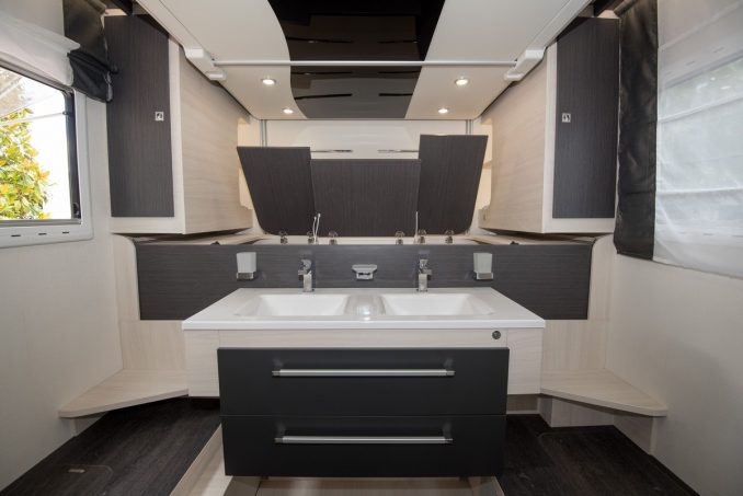 Avec son 338, Challenger a une nouvelle fois atteint son objectif : faire parler de la marque. Et malgré les avis divergents laissés sur notre chaîne YouTube à la découverte de ce plan atypique, le moins que l’on puisse dire c’est que les ingénieurs Challenger osent. Et ça paye puisqu’au sein de la rédaction, il obtient la palme de l’originalité et de l’innovation. C’est un bon début ! Lorsqu’on pénètre à bord de ce profilé 338, le salon lounge se distingue par son aspect aéré et spacieux qui se dégage de ce poste. Jusque-là rien de surprenant, et vous avez raison. En revanche, lorsque nous poussons la porte de démarcation entre la zone de vie et la partie arrière, nous arrivons non pas sur une chambre, mais sur une salle d’eau. Dotée en prime de deux vasques, comme à la maison. Du jamais vu ! Challenger a développé un système que la marque a baptisé SmartSuite revendiquant toutes les fonctionnalités d’une suite parentale avec rangements, salle d’eau donc et couchage. Le tout dans seulement 6m2.