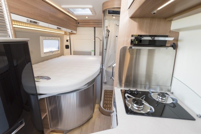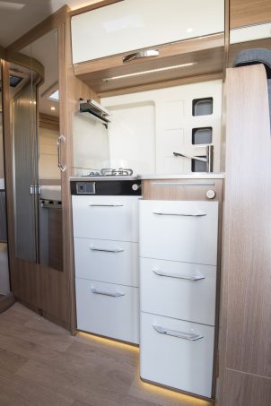 Rapido a réussi à loger une vraie cuisine en L. Le bloc est nanti d’un évier en Inox et d’un réchaud deux feux dont les abattants peuvent servir de plan de travail. Le réfrigérateur est un modèle étroit d'une capacité de 135 l .