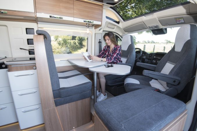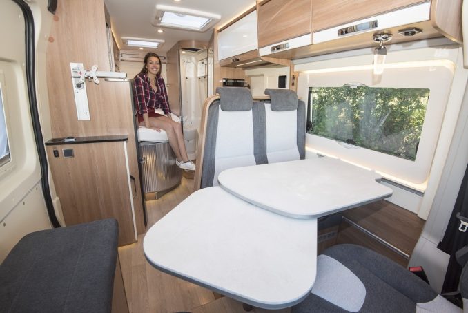 Avec le V62, Rapido revendique un esprit profilé dans une carrosserie de fourgon. Difficile de ne pas remarquer le toit panoramique en verre dans la casquette. Très bien intégré, il apporte un look moderne au Fiat Ducato et une importante luminosité à l’intérieur. Pas de cuisine dans l’entrée, mais un large sofa qui sert aussi de coffre à gaz. Cette assise complète la banquette face route et les sièges de cabine. L’ensemble forme un grand et confortable salon.