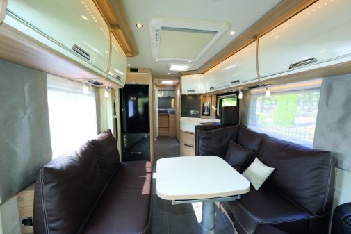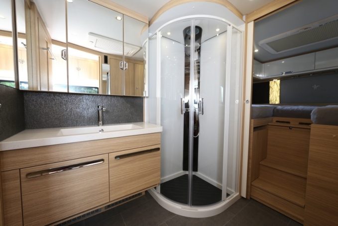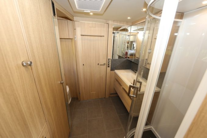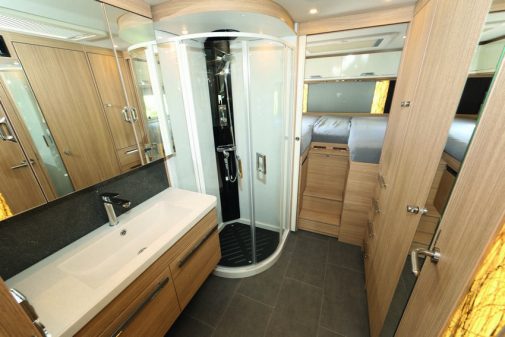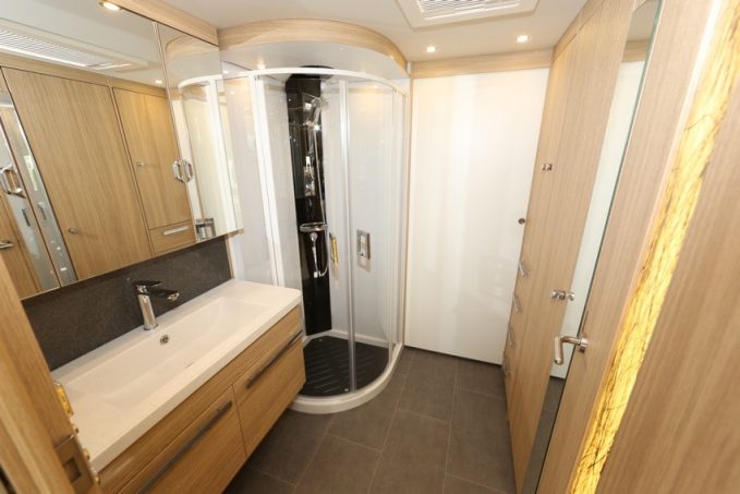 Celle-ci comporte une longue vasque surmontée d’une grande porte miroir dissimulant des placards. La douche est une vraie cabine, spacieuse, dans laquelle on pourra profiter de l’importante capacité en eau du véhicule. Pour augmenter l’autonomie en électricité, l’acheteur sera sans doute séduit par l’installation au lithium dont les prix sont certes élevés (voir présentation), mais le produit redoutablement efficace.