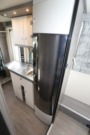 Aussi étonnant que cela puisse paraître pour un profilé étroit, la chambre est nantie d’un grand lit central (140 x 200 cm). Extraordinaire, non ? Une simple poussée permet de relever la tête du lit pour faciliter les déplacements dans la chambre. Nouveauté cette année, le véhicule peut recevoir en option deux couchages supplémentaires en dînette. La salle d’eau n’est pas très grande. C’est sur ce poste que le constructeur a été contraint de rogner. Elle reste toutefois bien exploitable et comporte tout ce que l’on attend dans un tel local : cabine de douche, lavabo, WC, rangements.