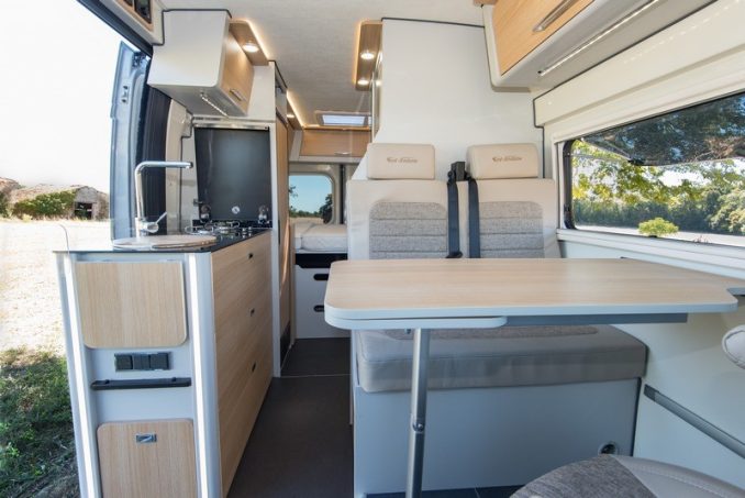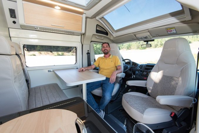 Si l’ambiance intérieure a été totalement revue l’an passé, offrant davantage de modernité et de luminosité, Font Vendôme a décidé sur sa gamme Séjour – et par conséquent sur son Leader Camp – de conserver la découpe de cabine, très tendance sur le marché du fourgon. En revanche, il sera également possible de loger en pavillon, un sky roof sur cette même partie, moyennant 1 390 €. Dans un autre registre, le Leader Camp affiche une dotation d’équipements cohérente : Traction+, régulateur/limiteur de vitesse, climatisation cabine, marchepied grande largeur, moustiquaire de portes, baies affleurantes… Pourvu de la motorisation de 140 ch, ce Leader Camp est commercialisé à 49 990 €.