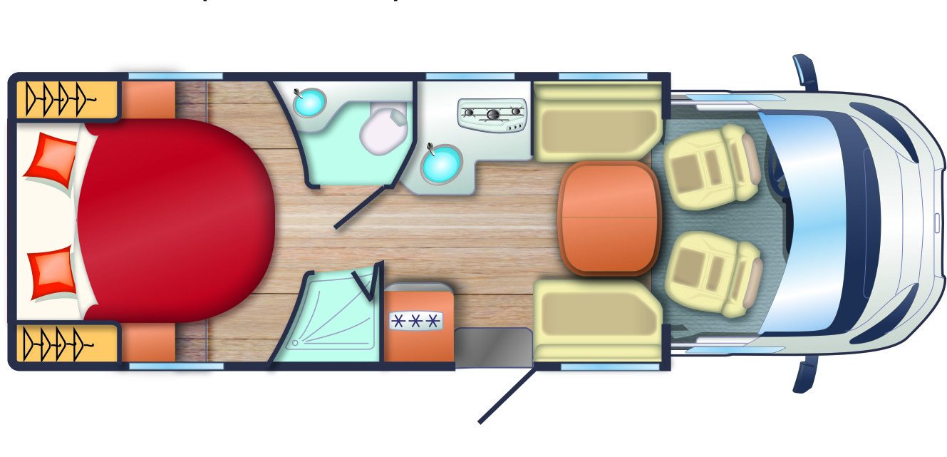 Le C86 est le seul profilé compact Rapido à offrir un vrai lit central de 140 x 196 cm, avec possibilité de rallonge de 15 cm. Comme toujours chez Rapido, le matelas est une mousse Bultex reposant sur un sommier à lattes. Celui-ci se relève pour donner accès aux volumes de rangement. Le lit est fixe. Il est toutefois possible de varier sa hauteur, en option. Dans cette configuration de base, le volume du garage est forcément un peu restreint. On peut néanmoins y entreposer des bicyclettes. Le salon est convertible en couchage d’appoint pour une personne. La salle est en deux compartiments séparés à double cloisonnement pour constituer une grande pièce unique. La cabine de douche est spacieuse. Idem pour le cabinet de toilette qui ne manque de rien.