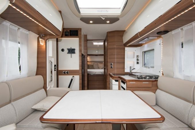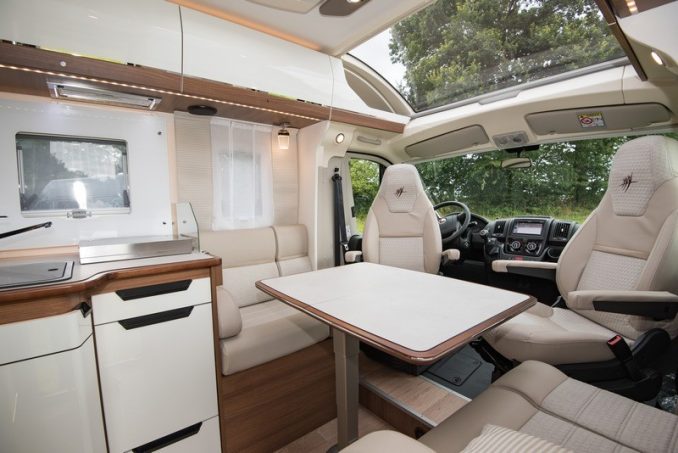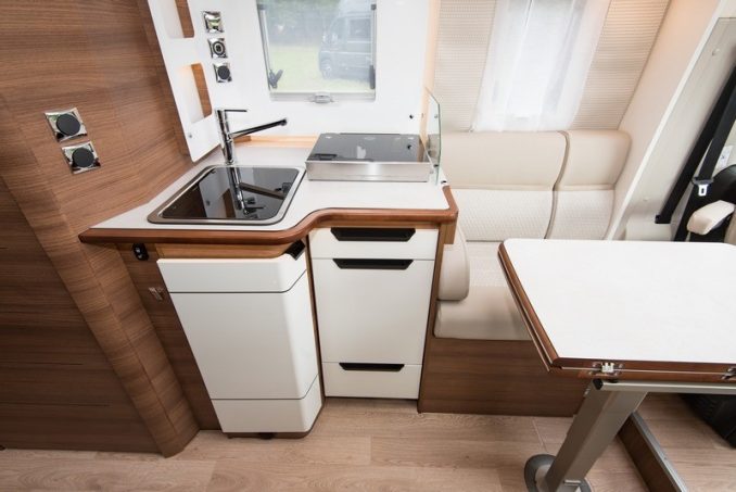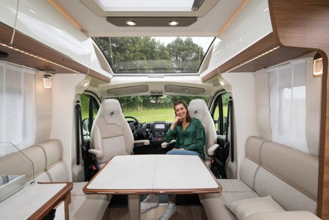 En toute franchise, nous avons eu un peu peur lorsque Rapido nous a annoncé avoir élaboré des profilés compacts en jouant sur la largeur de la cellule. Nos craintes n’étaient pas fondées que sur des a priori. Ceux de découvrir un habitacle tronqué et donc, difficile à vivre. En définitive, le résultat est tout autre. Dans le C86 que nous vous présentons, nous n’avons pas ressenti de sensation d’oppression en nous installant dans le salon. Bien au contraire. Le lieu, très lumineux, grâce à l’immense sky roof intégré dans la casquette, place les occupants dans un bien-être que certains autres camping-cars, même plus imposants, ne génèrent pas. C’est dire la prouesse. Vous êtes dans un petit véhicule avec l’impression de séjourner dans un grand. Le salon lounge ne peut certes recevoir que quatre personnes, mais elles sont confortablement installées sur les banquettes latérales et les sièges de cabine. Le mobilier Nacarat (un joli blanc brillant rehaussé de bois sombre) participe aussi allègrement à la luminosité intérieure. Une deuxième ambiance est disponible : la Bellagio avec des portes de placard façon bois et liseré chromé.