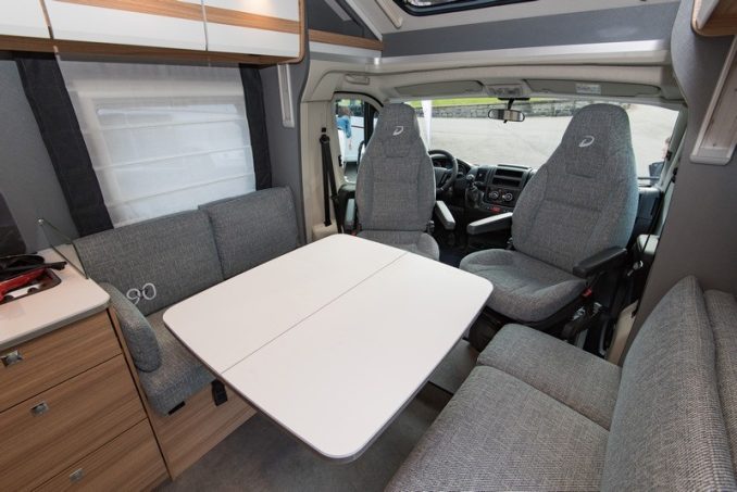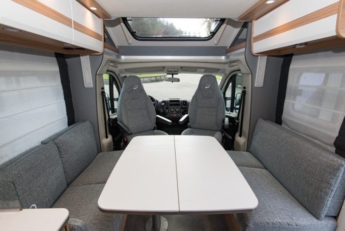 Avec 7,40 m de longueur, le T7052 DBL fait partie (au même titre que trois autres profilés de la série) des plus grands Just 90. A son bord, Dethleffs n’a pas lésiné sur les tendances du moment, en proposant un élégant et vaste salon face-face. Il permet d’accueillir 4 personnes aussi bien à l’étape (voir Nuit) que sur route. A bord, la hauteur sous plafond est agréable. Il faut dire que ce véhicule culmine à plus de 2,90 m hors tout. La luminosité directe et indirecte est bonne et met parfaitement en valeur le très réussi design intérieur. En effet, spécialement pour cette série anniversaire, les ingénieurs ont planché sur une teinte Rosario Cherry destinée au mobilier, créant ainsi une superbe harmonie avec la sellerie Metropolitan. Sans parler de la couleur anthracite utilisée pour les différentes parois internes.