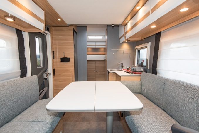 Ce profilé accueille un beau lit central de 150 x 180 cm, pourvu d’une rallonge de coussin de 15 cm. Ce qui étonne, c’est son positionnement haut dans le véhicule. Recevant un sommier fixe, il a le grand avantage de reposer sur une soute au volume impressionnant. L’objectif, recherché ici par Dethleffs, est de pouvoir charger un scooter voire une moto, à condition de ne pas dépasser un poids de 250 kg. L’accès au lit reste cependant simple grâce aux marches logées habilement dans les couloirs latéraux. Pour une utilisation à 4 personnes, le T7052 DBL peut s’enrichir d’un lit de pavillon en option. Il est électrique et présente un coût supplémentaire d’un peu plus de 1 500 €.