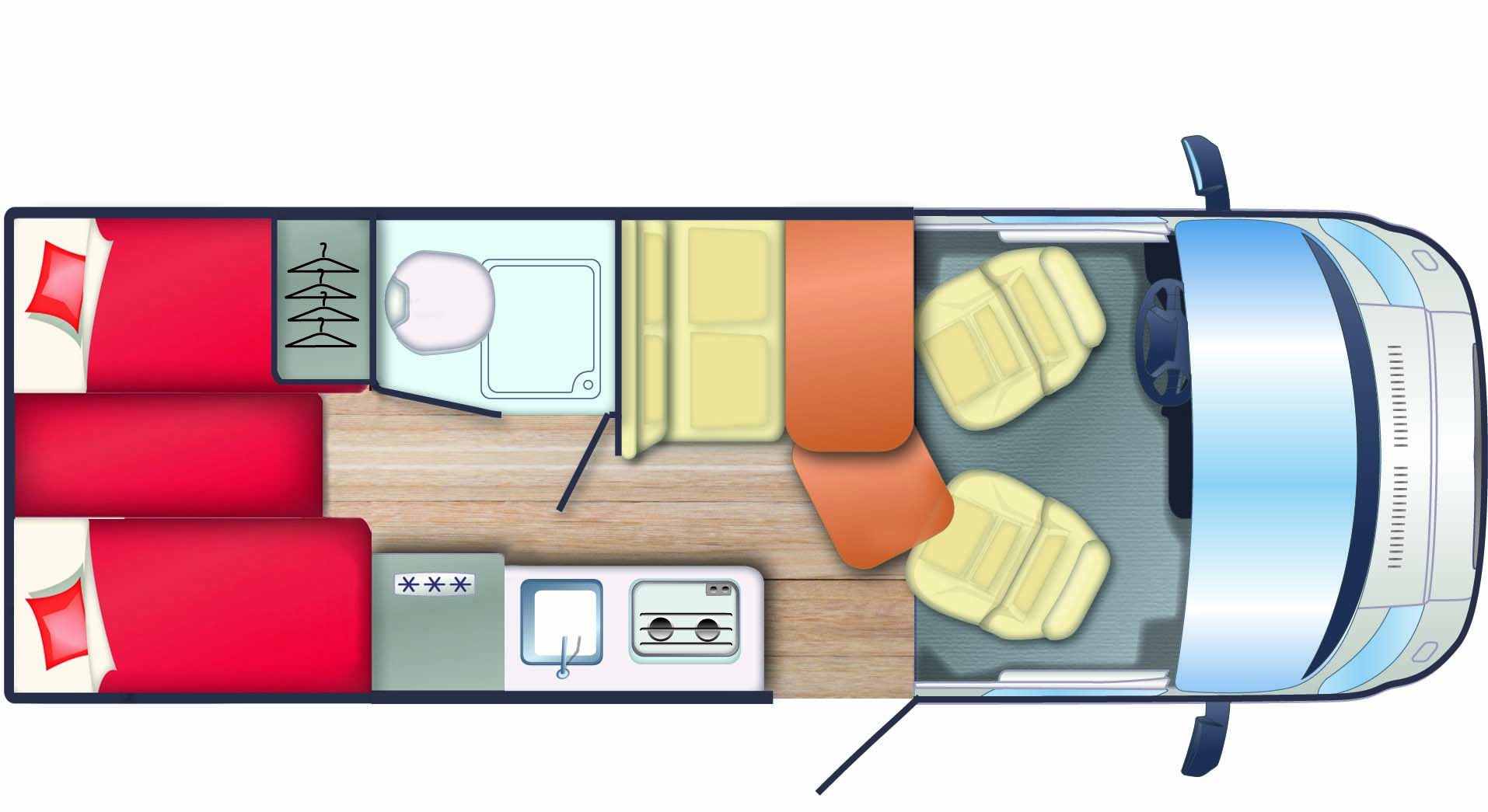 Unique fourgon à lits jumeaux de Campérêve, le 746 offre deux matelas de 80 cm de large pour 193 ou 195 de long. Les deux peuvent être joints par un coussin de complément. Une penderie est installée au pied du couchage de gauche. Si la chambre reste identique en tout point à celle de l’année dernière, la salle d’eau est quant à elle totalement inédite, avec un système baptisé Duo’Space permettant, à l’aide d’une paroi pivotante, de dédier l’espace au cabinet de toilette et au WC ou bien à la douche.