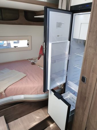 Le plan de cet A940 n’est pas sans rappeler celui de la capucine Sport 340. Original ? Oui, sans aucun doute. Dans la chambre, on trouve un grand lit transversal, réglable en hauteur (amplitude de ± 30 cm)… surmonté d’un lit de pavillon simple. Dans cet espace, il est donc possible de faire dormir 3 personnes. A cela s’ajoute le lit de cabine pour deux.