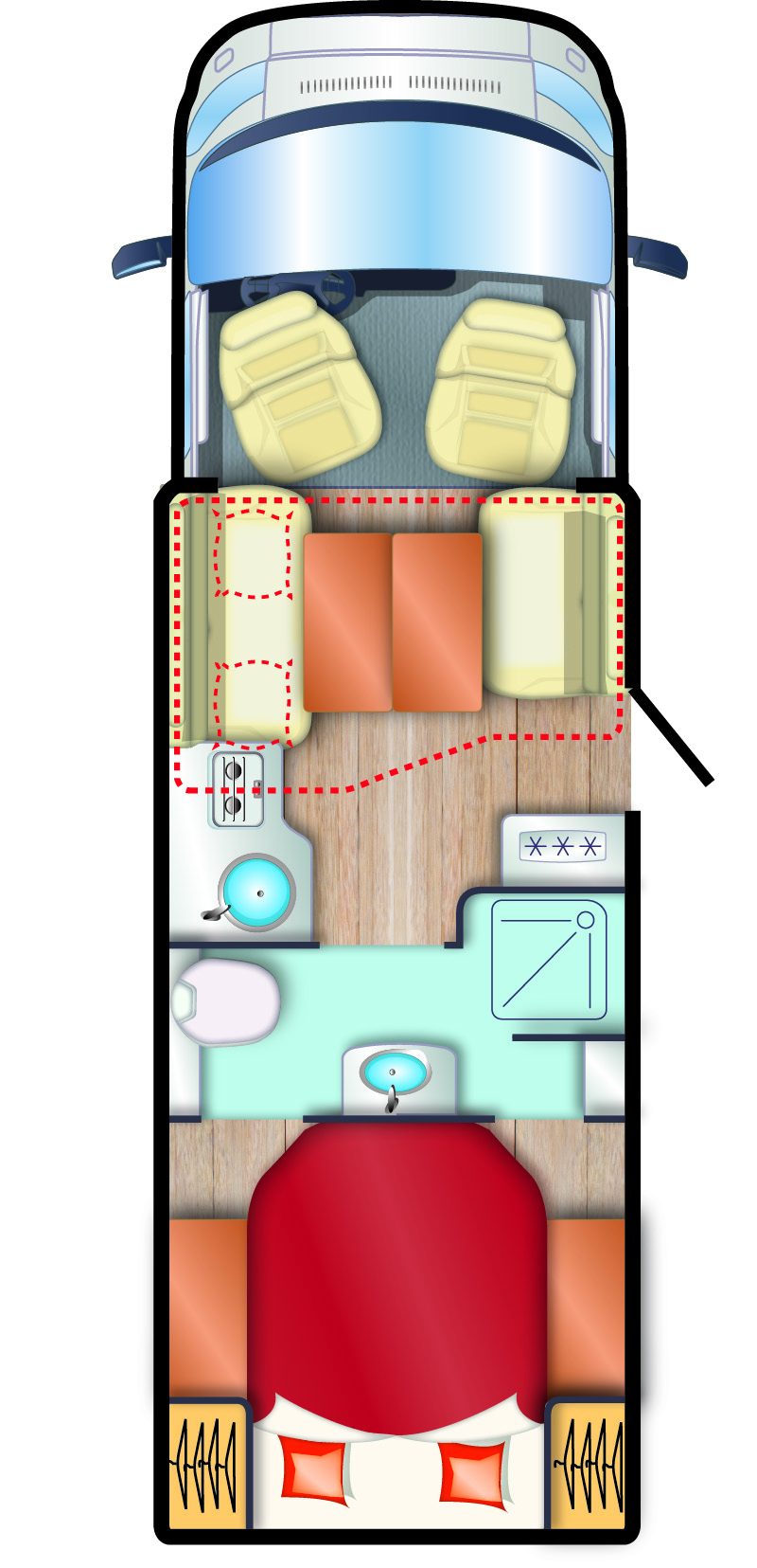Si la présence d’un grand lit central dans la chambre n’a rien de surprenant pour un modèle de ce gabarit, il est nettement plus étonnant de découvrir une salle d’eau avec lavabo adossé au pied du couchage, les toilettes et la douche étant repoussés de chaque côté. Une disposition qui semblait en perte de vitesse et qui n’a jamais été combinée à un salon face-face. Bien vu, donc, de la part de CI qui propose un camping-car unique sur le marché… exception faite de son clone Roller Team 266 TL.